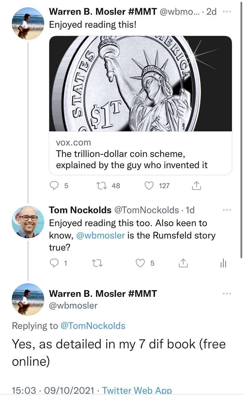 Warren Mosler is legendary for generosity with his time, and demonstrated this by replying to my low level tweet. To my embarrassment, I later realised the reference to Donald Rumsfeld learning MMT from Warren Mosler had a URL link in the article.